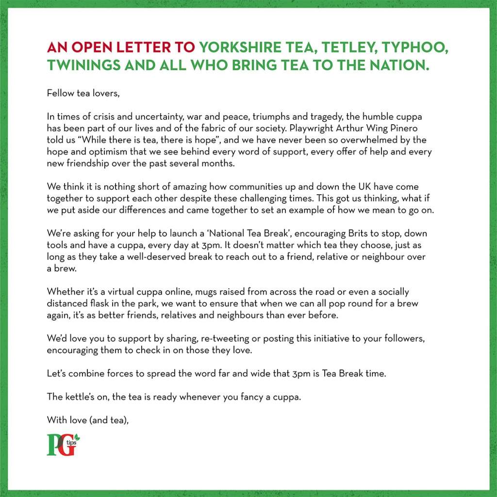 PG Tips has reached out to it’s competitors, Typhoo, Tetley, Yorkshire Tea and Twinings, to call a truce and come together to encourage the UK to take a much needed break during these unprecedented times.