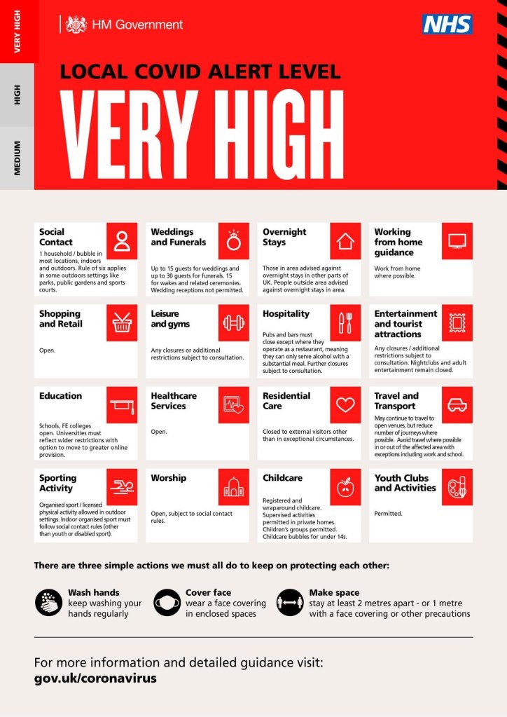 - People should avoid staying overnight in another part of the UK if they are resident in a ‘Very High’ area, or avoid staying overnight in a ‘Very High’ area if they are resident elsewhere.