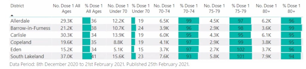 South Lakeland has vaccinated the most of its population of all the boroughs – this over 40 percent (37,000) of their population. (View the full vaccination statistics below).