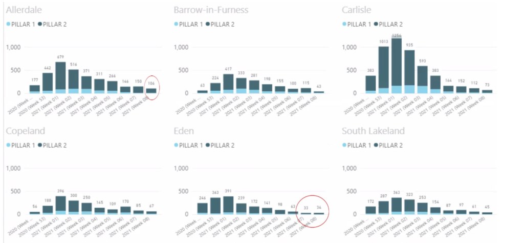 Allerdale had the greatest number of new cases for the second week in a row, with 106 new cases, and replaced Barrow-in-Furness in having the highest rate of new cases 108 new cases per 100k population.