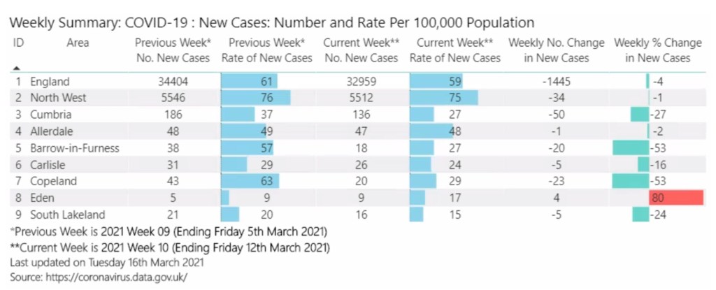 But Cumbria looks like it’s starting to get on top of the virus as rates in all Cumbrian districts were below both the national and regional average rates – 59 and 75 new cases per 100k population respectively.