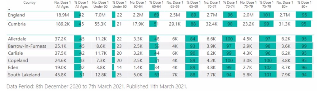Over 189,200 people throughout the county have now received their first dose of either the Pfizer or Oxford/AstraZeneca COVID-19 vaccine this is almost half (45 percent) of Cumbria’s adult population.