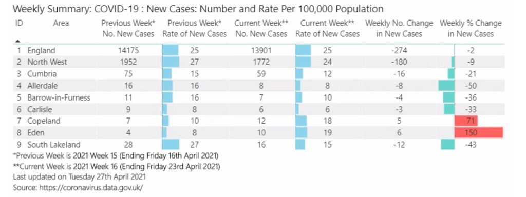 New cases decreased from the previous week in all Cumbrian districts except Eden and Copeland.