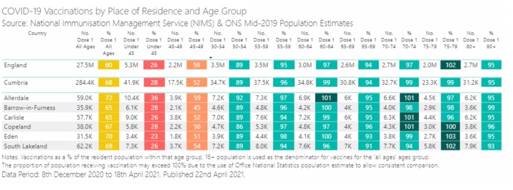 Allerdale and Eden have now both vaccinated over 70 percent of its adults and the other districts and boroughs aren’t far behind.