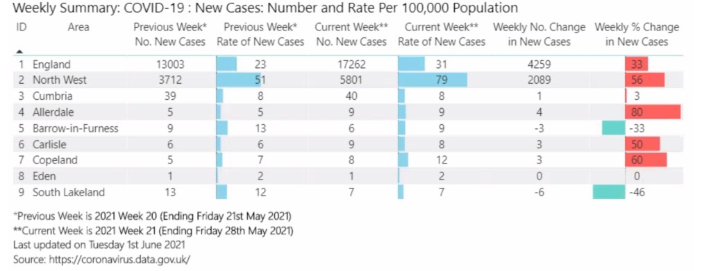 Allerdale and Carlisle had the joint greatest numbers of new cases – both with nine new cases.