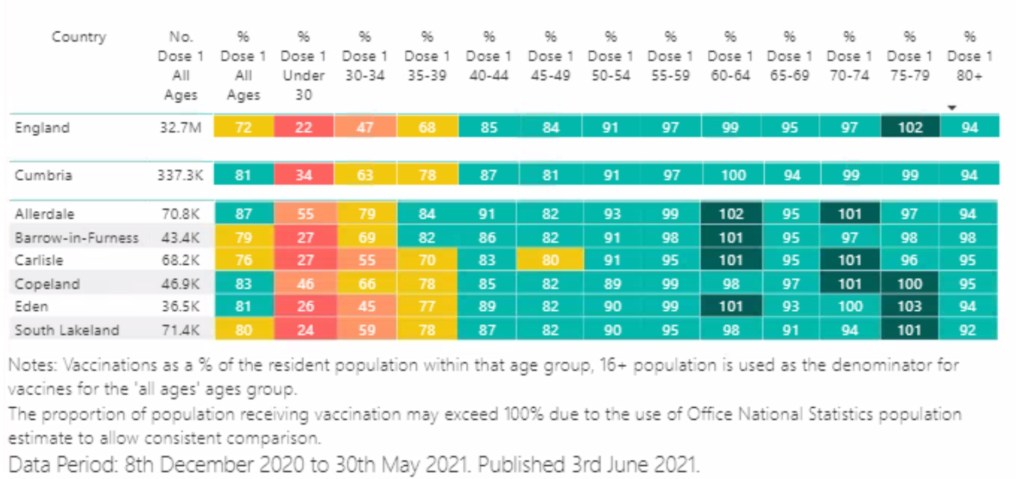 Allerdale, Copeland, Eden and South Lakeland have all vaccinated at least 80 percent of their adult population, with the other districts not far behind.