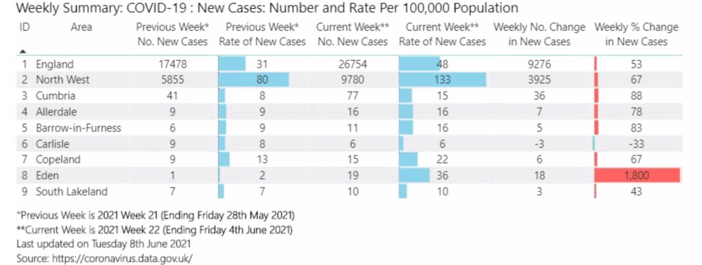 Eden had the greatest number of new cases (+19 new cases) and the north Cumbrian district also had by far the highest rate of new cases (36 new cases per 100k population).