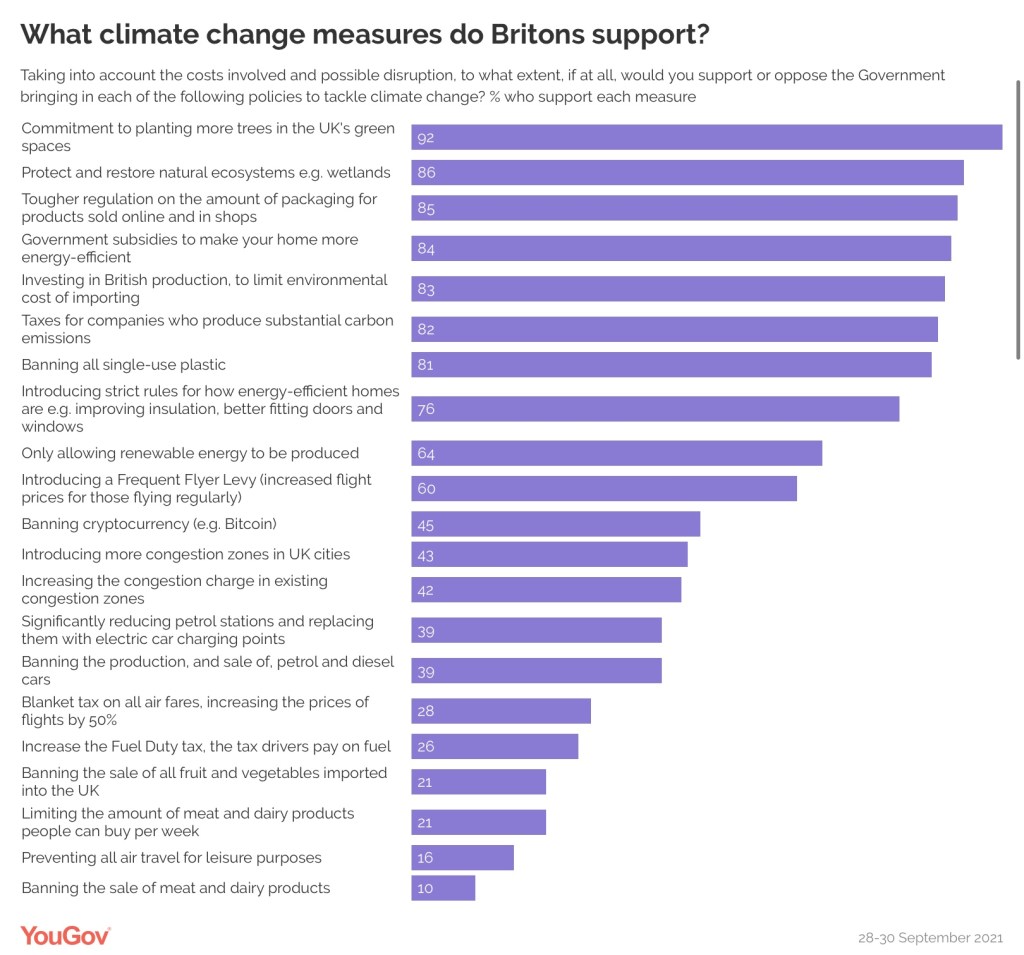 Topping the list are plants, 92 percent of Britons would support a commitment to plant more trees in the UK’s green spaces – 17,000 are due to be planted near to the conference itself.