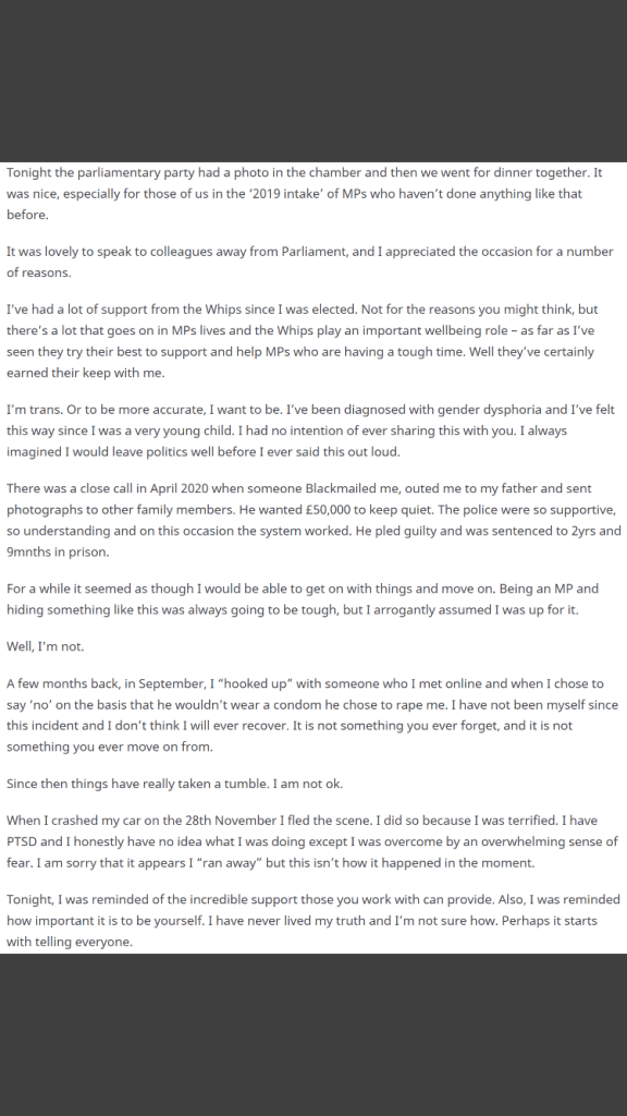 The MP for Bridgend and Pothcawl, Jamie Wallis, has issued a statement to say ‘I’m trans’.