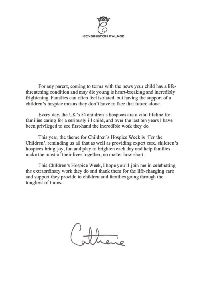 In it the Duchess asks everyone to join her in celebrating the extraordinary work the UK’s 54 children’s hospices do for children and young people with life-limiting conditions, helping families make the most of their lives together, no matter how short.