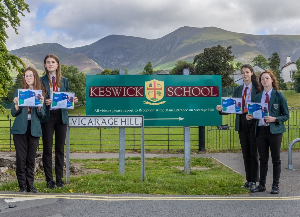 Keswick School students Sophia Grice, Isabella Scott, Tiana Purcell, and Isabella Gaskell win top prize for North West region in an annual contest that reopens this month to celebrate the NHS’s upcoming 75th birthday.