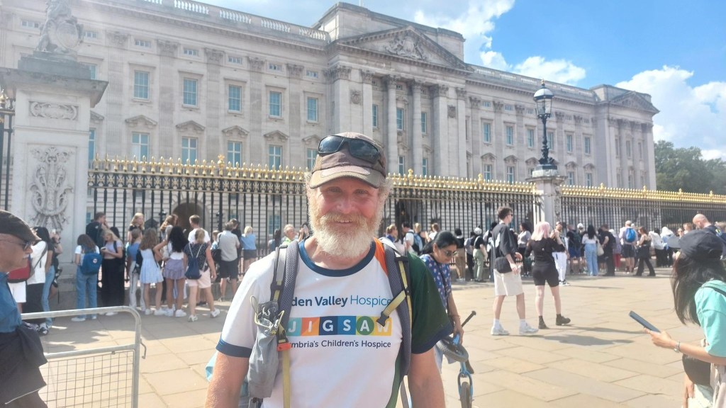 His challenge was officially complete when he made it to Buckingham Palace on Wednesday afternoon to be greeted by friends.