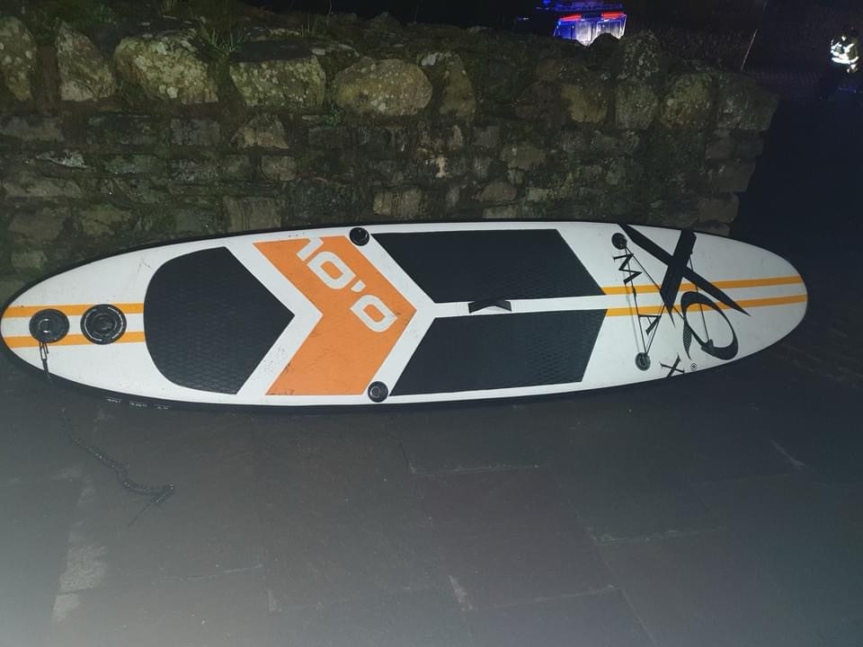 As part of the emergency call, this paddleboard was located, unattended in the middle of the lake, the ankle leash has snapped.