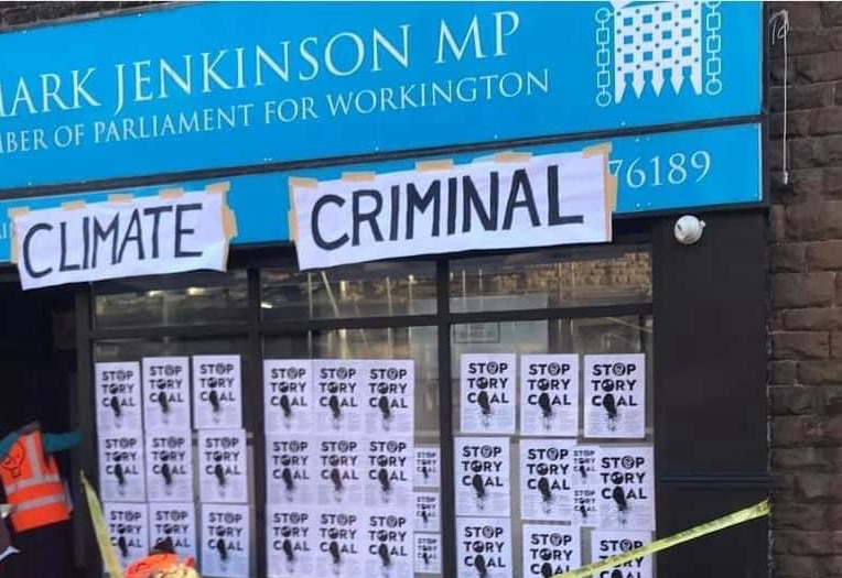Just Stop Oil targeted the office of Workington MP, Mark Jenkinson with signs saying “climate criminal”.