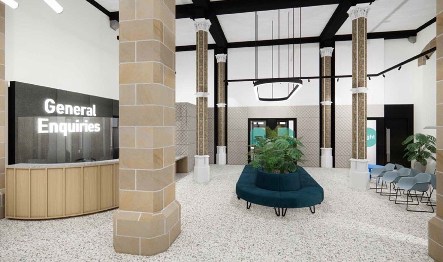 The work would restore the impressive public entrance, which in the 20th century has been diminished by the addition of low-level screens and partitions. Refurbishment proposals include removing these partitions, stripping out suspended lighting and vinyl floor covering and bringing in new reception desks and furniture.