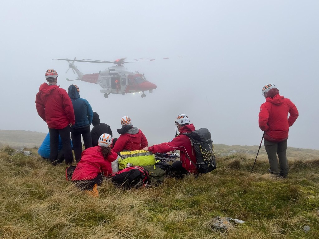 The man was given shelter and was treated by MRT members. The teams witnessed some very impressive low level flying from the Coast Guard whose only option was to visually follow the terrain, from a clear window in the cloud far below, up the ridge to the casualty site.