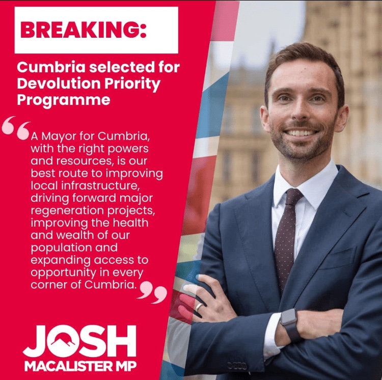 “Mayors have a proven track record of delivering growth and higher living standards. A Mayoral Combined Authority is our best route to improving local bus and train services, upgrading roads like the A595 and A590, driving forward major regeneration projects, improving the health and wealth of our population, and expanding access to opportunity in every corner of Cumbria.